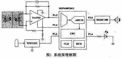 系統(tǒng)由主控芯片、煙霧檢測模塊、報(bào)警模塊和電源模塊四部分組成。主控芯片采用16位超低功耗單片機(jī)MSP430F2012,每隔8s進(jìn)行一次煙霧檢測,通過F2012芯片I/O口輸出32768Hz信號(hào)驅(qū)動(dòng)紅外發(fā)射部分發(fā)出紅外線,同時(shí)使用片內(nèi)10位ADC對經(jīng)過放大的紅外信號(hào)進(jìn)行連續(xù)4次的數(shù)據(jù)采集轉(zhuǎn)換,取平均值作為檢測結(jié)果。同時(shí)將檢測結(jié)果與預(yù)設(shè)報(bào)警門限值進(jìn)行比較,從而發(fā)送預(yù)警信息。同時(shí)還利用了430內(nèi)部低頻時(shí)鐘VLO準(zhǔn)確定時(shí),高頻時(shí)鐘DCO高速工作,在降低系統(tǒng)成本的同時(shí)提高了系統(tǒng)的可靠性。