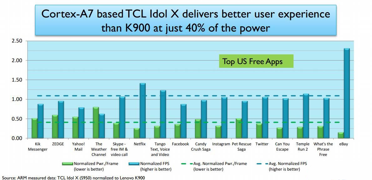 在采訪(fǎng)現(xiàn)場(chǎng),Brian Jeff向記者展會(huì)了采用ARM big.LITTLE技術(shù)四核TCL手機(jī),其功耗較性能類(lèi)似的聯(lián)想K900手機(jī)平均低了40%。