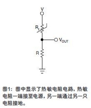 當精度要求提高到±0.1℃時,溫度范圍就要折衷到更小的范圍(小于100℃),此時可以用熱敏電阻。與RTD類似,熱敏電阻的電阻值也是隨溫度而變化。熱敏電阻通常會接成一個電阻分壓器結構,其中另一只電阻與熱敏電阻有相同的標稱值(25℃室溫下的阻值)。熱敏電阻的一端接至電源,另一端接另一只電阻,然后接地(圖1)。探測溫度時,測的是分壓器中點的電壓??梢灶A計,在25℃時的電阻為+V/2。如有偏差,則可以計算出熱敏電阻的阻值,并用一個查找表確定出被測的環(huán)境溫度。