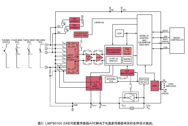 總之,溫度傳感器都需要偏置(可以是電壓或電流)。對于熱電偶來說,需要做冷結補償。德州儀器公司的LMP90100是一款24位傳感器模擬前端(AFE),它有四個差分或七個單端輸入、兩個匹配的可編程電流源,以及連續(xù)后臺校準功能(圖2)。這款集成的可配置芯片可解決各種與溫度傳感器有關的設計挑戰(zhàn)。
