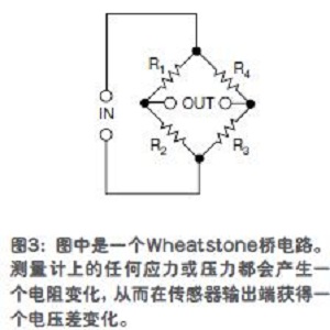 采用Wheatstone橋電路的應變計與稱重傳感器常用于測量壓力、力與重量。元件被施加任何應力或壓力后,都會產生一個電阻變化,從而在傳感器輸出端出現(xiàn)一個電壓差變化(圖3)。這些傳感器產生的電壓很低,通常在毫伏范圍。要獲得最精確的測量,必須將這個小電壓放大到數(shù)據(jù)轉換器的整個動態(tài)范圍內??删幊淘鲆娣糯笃?PGA)級可以與多個傳感器相連接,有最好的靈活性。這一級應有低噪聲、低偏移、低漂移的特性,以確保最佳的系統(tǒng)性能。
