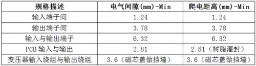 作為二次電源,G\H系列電源產(chǎn)品的變壓器使用漆包線做基本絕緣,塑膠磁芯蓋作為擋墻,產(chǎn)品內(nèi)部充分灌封了樹脂,以起到各電氣部分的介質(zhì)絕緣以及散熱作用;同時,該系列產(chǎn)品增加了爬電距離,以進(jìn)一步加強(qiáng)產(chǎn)品的絕緣特性。產(chǎn)品的電氣間隙和爬電距離如表2所示。