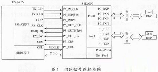 設計過程中,使用88E6060的port5作為MII接口與DSP6455的EMAC接口進行連接,port0~port4可以任意使用,作為PHY對外進行連接。本設計以應用port0和port1為例進行說明,其他情況相似。配置時將88E6060的ENABLE_MII5和DISABLE_MII4管腳懸空,通過其內(nèi)部上拉/下拉使能port5的MII口,DSP6455通過MDIO接口對88E6060的內(nèi)部PHY寄存器進行訪問,通過EMAC接口發(fā)送和接收網(wǎng)絡數(shù)據(jù)。