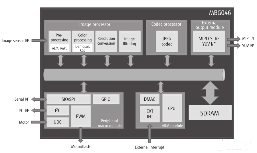 注:AE:自動(dòng)曝光;AF:自動(dòng)對(duì)焦;ARM:利用ARM有限公司構(gòu)建的平臺(tái)進(jìn)行高速處理;AWB:自動(dòng)白平衡;CSC:色彩空間轉(zhuǎn)換;CSI:相機(jī)串行接口;DMAC:直接存儲(chǔ)訪問控制器;EXT:外部;GPIO:通用輸入/輸出;I2C:內(nèi)部集成電路;INT:內(nèi)部;MIPI:移動(dòng)行業(yè)處理器接口;PWM:脈寬調(diào)制;SIO:串行輸入/輸出;SPI:串行外設(shè)接口;UDC:USB設(shè)備控制器;YUV:由亮度和色差組成的信號(hào)格式。