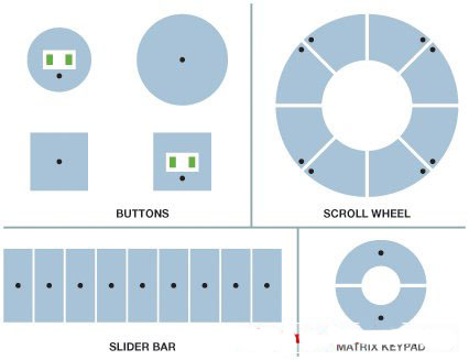 電容式觸摸傳感器以類似圖1所示的按鈕、滑動條、滾輪或其他方式提供一種用戶界面。