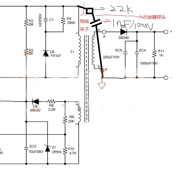 YCAP具體操作是先做一個小治具,用一個1NF、1000V的高壓瓷片電容和一個22K插件電阻串聯(lián)在一起,接下來就是要接在電路上,要注意的是既然是測YCAP當(dāng)然是要無Y的條件下測得的。把做好的小治具搭接在你需要測試的板子上,電阻的一端接在反激電路中初級的靜點上即bulk電容端,另外電容端接在次級的靜點端即輸出地上,此時用示波器去測夾子夾在電容連接初級電容的一端,表筆夾在電容和插件電阻連接的地方。以上就是測試方法,尤其對LED驅(qū)動電源有很好的幫助,以上測試接的負(fù)載是LED燈,電子負(fù)載的反應(yīng)速率可能不是很好。 接下來就是要看波形圖。