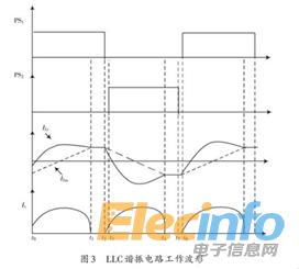 LLC電路根據(jù)開關(guān)頻率范圍可以分為四種模式,本文只討論fr》fs》fm模式下的工作原理,一個開關(guān)周期內(nèi)整個工作過程如下所述,工作波形如圖3所示,PS1,PS2分別為Q1,Q2的驅(qū)動脈沖波形: