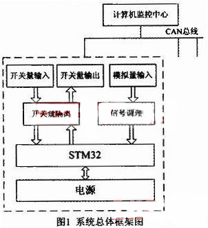 系統(tǒng)總體設(shè)計(jì)框圖如圖1所示。本設(shè)計(jì)采用ST公司生產(chǎn)STM32F103RCT6作為系統(tǒng)的主處理器。STM32系列基于專為要求高性能、低成本、低功耗的嵌入式應(yīng)用專門設(shè)計(jì)的ARM Cortex-M3內(nèi)核,它集成了兩個(gè)CAN控制器,并為每個(gè)CAN控制器分配了256字節(jié)的SRAM,每個(gè)CAN控制器有3個(gè)發(fā)送郵箱和兩個(gè)接收FIFO。它主要負(fù)責(zé)采集、處理開(kāi)關(guān)量和模擬量輸入,控制開(kāi)關(guān)量輸出,同時(shí)通過(guò)CAN總線完成與上位機(jī)的通信。