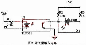 開(kāi)關(guān)量輸入電路如圖2所示。其中X1為輸入端,P1為微控制器端口,LED0為輸入點(diǎn)的狀態(tài)指示燈,TLP521為光電耦合器,它實(shí)現(xiàn)現(xiàn)場(chǎng)與PLC的CPU電氣隔離,提高抗干擾性。