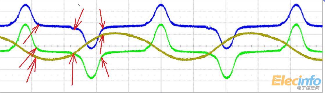 從左向右數(shù)的第一組箭頭所指之處是進(jìn)入飽和點(diǎn),大家可以看到黃色的電流向反方向逐漸增大,進(jìn)入保護(hù)點(diǎn)后,藍(lán)色的和綠色的次級線圈的電壓波形幾乎是0了,說明變壓器已經(jīng)沒有耦合了,已經(jīng)進(jìn)入了飽和區(qū)了,次級沒有電壓,意味著三極管沒有驅(qū)動(dòng)信號,試問大家,這時(shí)兩個(gè)三極管處于什么狀態(tài)?
