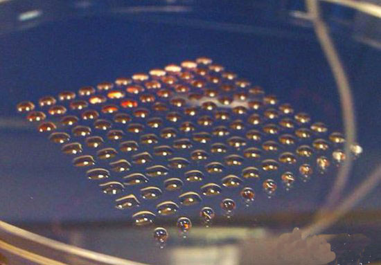 這篇報告由英國牛津大學(xué)的黑根·貝利教授及其同事聯(lián)名發(fā)表。據(jù)介紹,他們利用3D打印機(jī)分層次噴出大量被脂類薄膜包裹的液滴,這些液滴形成網(wǎng)狀結(jié)構(gòu),構(gòu)成特殊的新材料。