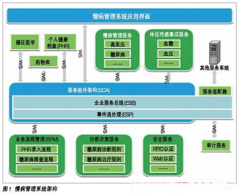 系統(tǒng)的通用組件包括了企業(yè)服務(wù)總線、事件流處理、服務(wù)組件架構(gòu)、業(yè)務(wù)流程管理、診療決策服務(wù),這5個(gè)組件都有相應(yīng)的軟件實(shí)現(xiàn),慢病管理系統(tǒng)只是將其進(jìn)行了整合,以實(shí)現(xiàn)SOA架構(gòu)。其中企業(yè)服務(wù)總線、事件流處理、服務(wù)組件架構(gòu)是SOA架構(gòu)的基礎(chǔ)。企業(yè)服務(wù)總線用于集成不同的應(yīng)用,它所提供的服務(wù)適配器可以讓慢病系統(tǒng)和其他服務(wù)系統(tǒng)( 如HIS、電子病歷等)進(jìn)行集成,從而解決了與其他醫(yī)療信息系統(tǒng)如何進(jìn)行數(shù)據(jù)交互的問(wèn)題。事件流處理用于監(jiān)測(cè)系統(tǒng)中發(fā)生的所有事件,并對(duì)發(fā)生的事件進(jìn)行相應(yīng)的處理,主要用于數(shù)據(jù)的實(shí)時(shí)分析、統(tǒng)計(jì),可以用于審計(jì)工作。服務(wù)組件架構(gòu)則用于將各種Web 服務(wù)整合,重新封裝為合適的組件服務(wù),通過(guò)這一技術(shù),可以容易將系統(tǒng)擴(kuò)展為分布式服務(wù)。同時(shí),對(duì)于服務(wù)使用者而言,這種擴(kuò)展是完全透明的,可實(shí)現(xiàn)“服務(wù)云”的功能,而該技術(shù)最大的好處是不需要花大量的資金來(lái)創(chuàng)建“云計(jì)算”基礎(chǔ)架構(gòu)就可以提供相似的功能。業(yè)務(wù)流程管理、診療決策服務(wù)用于可視化的創(chuàng)建慢病管理流程和診療決策,并將創(chuàng)建結(jié)果即時(shí)應(yīng)用于系統(tǒng)中。由于系統(tǒng)開(kāi)發(fā)人員往往無(wú)法真正了解醫(yī)療方面的內(nèi)容,使用這兩個(gè)組件便可以讓醫(yī)生參與到系統(tǒng)的設(shè)計(jì)中來(lái),真正滿足醫(yī)生的業(yè)務(wù)需求,從而提高系統(tǒng)的實(shí)用性和靈活性。