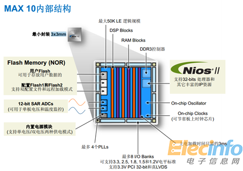 為了能夠解決FPGA的這一缺陷,一直以來,制造商們都在苦苦找尋合適的方案,伴隨工藝的不斷改進(jìn),兼具CPLD與FPGA優(yōu)點(diǎn)的芯片最終還是如期而至,恰逢Altera公司進(jìn)入中國市場三十周年之際,也是該系列芯片的第十代產(chǎn)品,這款被譽(yù)為“下一代非易失FPGA”的芯片被Altera命名為“MAX10 FPGA”。