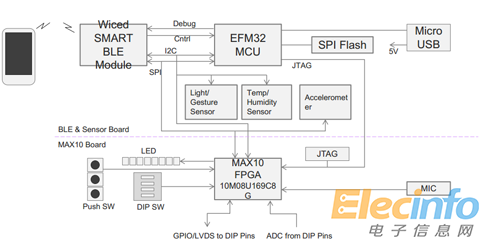 據(jù)介紹,“奧德賽(Odyssey)”開發(fā)套件主要由兩塊主板構(gòu)成:一塊MAX10 FPGA板卡和一塊藍(lán)牙及傳感器板卡。其中,MAX10 FPGA板卡以Altera的MAX10為核心,帶有30個插針的擴(kuò)展接口、紐扣電池接口、JTAG調(diào)試接口、各種開關(guān)/按鈕和8個LED。相比而言,藍(lán)牙及傳感器板集成了一個藍(lán)牙4.0模塊、一個32位處理器、溫度/濕度傳感器、紫外線/光敏/距離傳感器和加速度傳感器,用戶可以在手機(jī)應(yīng)用程序中進(jìn)行個性化的設(shè)置,從而快速體驗MAX 10和傳感器的各種特性。