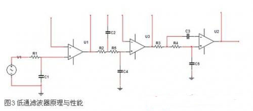 在本設(shè)計(jì)中,信號(hào)頻率較低,在0.78~3.33Hz之間,因此濾波器的設(shè)計(jì)成為本電路的關(guān)鍵。首先,要經(jīng)過(guò)一個(gè)0.5Hz的高通濾波器,以濾出傳感器的熱電干擾,然后再經(jīng)過(guò)一個(gè)低通濾波器以濾除心音信號(hào)的絕大多數(shù)干擾。在實(shí)現(xiàn)電路中,普通的濾波器已經(jīng)很難對(duì)這么低的信號(hào)進(jìn)行濾波,因此在本設(shè)計(jì)中采用增益變化較平坦的巴特沃斯濾波器。其中,高通為二階的巴特沃斯濾波器,低通為截止頻率為5Hz的巴特沃斯濾波器。圖3為低通濾波的原理圖。