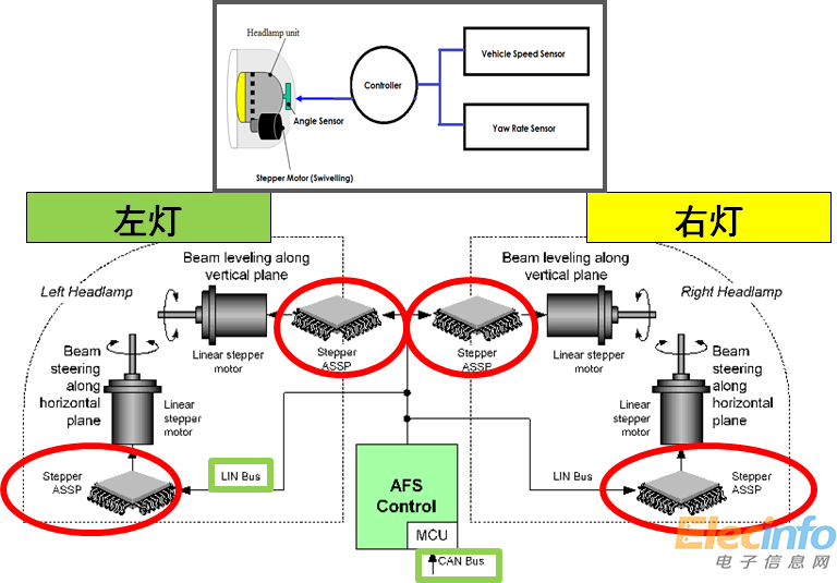 前大燈控制器基于懸掛傳感器數(shù)據(jù)、橫擺角速度、車體轉(zhuǎn)向角度和車速采用合適的光束角度,并向最終控制的前大燈發(fā)送高調(diào)平調(diào)節(jié)命令。然后一對(duì)步進(jìn)電機(jī)專用標(biāo)準(zhǔn)產(chǎn)品(ASSP)將來(lái)自前大燈控制的高調(diào)平調(diào)節(jié)命令轉(zhuǎn)換為必要的電機(jī)定位信號(hào),以調(diào)平或旋轉(zhuǎn)前大燈光束。