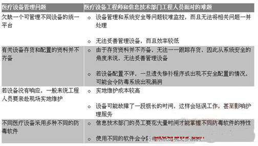 由于醫(yī)院不斷添購新設(shè)備,輔助醫(yī)療和信息技術(shù)部門的工作人員每日面對的工作也不斷增加。有關(guān)的工作包括管理存貨、配置系統(tǒng)、載入修補(bǔ)程序、執(zhí)行防護(hù)功能、以及提供保修和維護(hù)服務(wù)。圖表1列出醫(yī)療設(shè)備工程師和信息技術(shù)工程師面對的問題以及這些問題對醫(yī)院日常運(yùn)營所產(chǎn)生的影響。