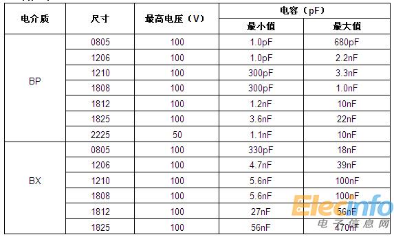 MIL-PRF-123系列MLCC的最高電壓為100V,器件采用BP電介質(zhì),電容低至1.0pF,-55℃~+125℃溫度范圍內(nèi)電容溫度系數(shù)(TCC)為0ppm/°C±30ppm/°C,每十年的最大老化率為0%。BX器件的電容達(dá)470nF,-55℃~+125℃范圍內(nèi)TCC為±15%,每十年的最大老化率為1%。