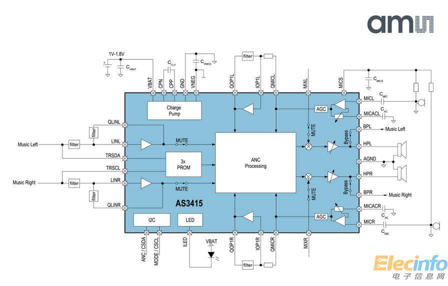 得益于艾邁斯半導體先進的模擬半導體技術,AS3415主動降噪揚聲器驅動器具有高達30dB的降噪性能,其有效降噪帶寬高達3.5kHz。在降噪模式下,1.5V電壓運行時該器件的標準功耗僅為10mW。此外,AS3415無需接通任何電源便可啟動內部旁路模式,確保用戶在關閉主動降噪功能時,仍可通過音頻輸出收聽音樂。