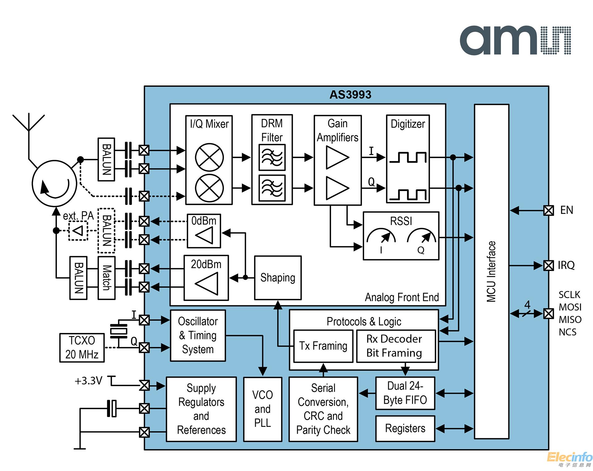 1153的開發(fā)團(tuán)隊(duì)在初步設(shè)計(jì)階段所面臨的瓶頸來(lái)自性能、尺寸和功耗三方面的制約。Technology Solutions有限公司選用的AS3993來(lái)自艾邁斯半導(dǎo)體,采用緊湊的7mmx7mm QFN48封裝。該器件的運(yùn)行電壓可低至2.7V,并能兼容1153閱讀器中的1,130mAh鋰聚合電池。在正常運(yùn)作模式下,AS3993只需65mA的電流。