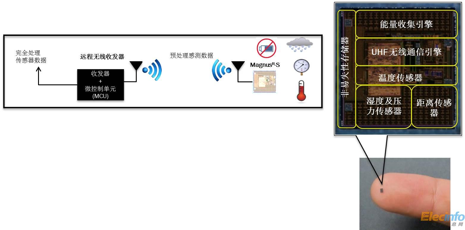 智能無源傳感器的核心是MagnusR-S IC和一個遠程無線收發(fā)器。MagnusR-S是一個系統(tǒng)單芯片,集成了能量收集引擎、感測濕度或壓力的ChameleonTM傳感器引擎、溫度傳感器、感測接收到的能源的距離傳感器及存儲獨特ID的非易失性存儲器;遠程無線收發(fā)器用于收集感測信息并對其進行后處理,每秒能收集來自100個傳感器的數(shù)據(jù)。