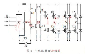 如圖2所示,TL、RL構(gòu)成泵升電壓吸收電路[5],當(dāng)電機(jī)負(fù)載進(jìn)入制動狀態(tài)時,反饋電流將向中間直流回路電容充電,導(dǎo)致直流電壓上升。當(dāng)直流電壓上升到一定值時,控制TL導(dǎo)通,使這部分能量消耗在電阻RL上,確保變頻器可靠安全地工作。此外,由J1常閉觸點與R4 組成斷電能量釋放電路。當(dāng)系統(tǒng)發(fā)生故障或關(guān)機(jī)時,繼電器J1斷電,通過其常開觸點,將變頻器與電網(wǎng)斷開;而常閉觸點閉合,利用R4為中間回路大電容所儲存的能量提高釋放通道。