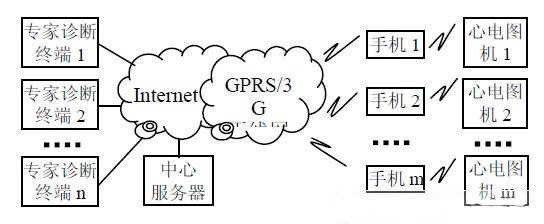 心電圖是一門較為深奧的學(xué)科, 一般情況下, 基層醫(yī)療單位醫(yī)生、心血管患者不可能都是心電圖方面的專家。 本文提出的系統(tǒng)以具有優(yōu)質(zhì)資源的醫(yī)療機構(gòu)為服務(wù)中心, 通過Internet 網(wǎng)絡(luò)與多個位于鄉(xiāng)鎮(zhèn)或農(nóng)村、重點監(jiān)護病人的心電圖機終端互連, 在一定程度上解決“看病難”問題。 本系統(tǒng)主要由如下4 部分組成: 心電圖機、安裝有專用軟件的手機、專家診斷終端、1 個醫(yī)療中心服務(wù)器, 系統(tǒng)結(jié)構(gòu)框圖如圖1 所示。