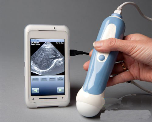 上圖所示的產(chǎn)品是世界首個智能手機超聲成像系統(tǒng)Mobisante,名為MobiUS SP1超聲系統(tǒng)。這款產(chǎn)品已經(jīng)通過了FDA認證,旨在降低醫(yī)療成本,改善不具備成像中心地區(qū)的診斷條件。