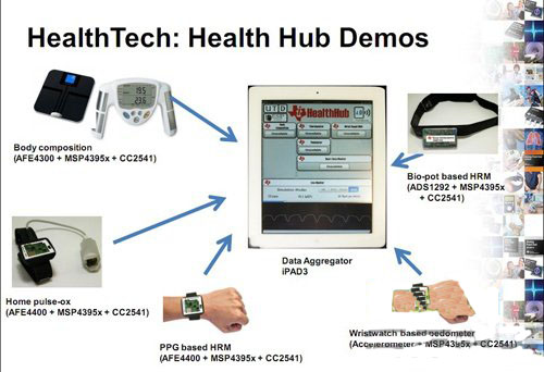 目前,智能醫(yī)療消費(fèi)市場(chǎng)已經(jīng)逐漸從診療向個(gè)人保健過(guò)渡,消費(fèi)者也對(duì)產(chǎn)品的便攜度提出了更高的要求。為此。TI提出了一系列以創(chuàng)新方式提高整合度、降低功耗,并擁有智能連接的組件,讓便攜醫(yī)療/健身更靈活,價(jià)格更實(shí)惠。此次展出的解決方案主要用于心率監(jiān)護(hù)、計(jì)步器、指夾式血氧儀、人體成分分析儀、心率帶等產(chǎn)品。這些測(cè)試設(shè)備的測(cè)試結(jié)果都可以通過(guò)無(wú)線網(wǎng)絡(luò)下載到IPad這一平臺(tái)。