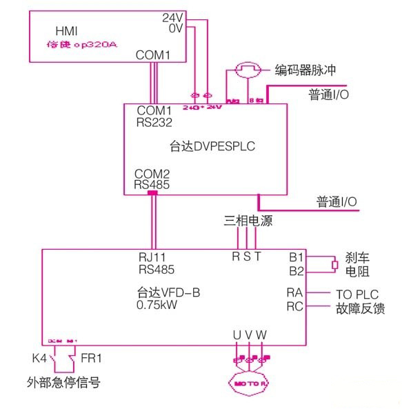 plc作為控制的核心,主要用來接收編碼器的反饋信號實現對當前位置的檢測,通過和設定值的比較用通訊功能來控制變頻器的輸出頻率從而實現精確定位。同時通過hmi可以方便的設定plc的一些內部寄存器值進行人機交互,并且變頻器的工作頻率可以在hmi上方便修改和直觀顯示。臺達的dvp系列plc都具有兩個通訊口,com1是 rs232,com2是rs485,支持modbus ascii/rtu通訊格式,通訊速率最高可達115200bps,兩通訊口可以同時使用。所以無需用任何擴展模塊就可以實現既可連接用于參數設置的人機界面又可用通訊的方式控制變頻器等其它設備。并且dvp系列plc提供了針對modbus ascii/rtu模式的專用通訊指令,這樣在編寫通訊程序時就可以大大簡化,無需像用串行數據傳送指令rs那樣要進行復雜的校驗碼計算和遵循復雜的指令格式。臺達的vfd系列變頻器內建有單獨的rs-485串聯(lián)通訊界面,并且也遵循modbus ascii/rtu通訊格式(vfd-a系列除外)?;c這些特點選用了性價比優(yōu)異的dvp es plc和vfd-b變頻器。整個系統(tǒng)的結構圖如圖1所示。