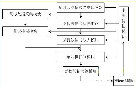 通過(guò)反射式脈搏波光電傳感器采集到包含人體多種生理參數(shù)的信號(hào),然后由脈搏波信號(hào)濾波電路與脈搏波信號(hào)放大模塊對(duì)信號(hào)進(jìn)行濾波和放大,并和鼠標(biāo)數(shù)據(jù)采集模塊采集的數(shù)據(jù)在鼠標(biāo)數(shù)據(jù)與脈搏波數(shù)據(jù)采集處理共用的單片機(jī)控制模塊匯集,經(jīng)過(guò)進(jìn)一步處理之后傳輸?shù)綌?shù)據(jù)轉(zhuǎn)換傳輸模塊形成適合傳輸?shù)诫娔X端的信號(hào)形式,再經(jīng)由Micro USB接口傳輸?shù)诫娔X端進(jìn)行進(jìn)一步的信號(hào)處理和顯示。