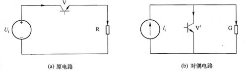 如圖1(a)是一個串聯(lián)晶體管原電路,如圖1(b)為它的對偶電路。其中開關(guān)管V與V'對偶,電壓源與電流源對偶,電阻R與電導(dǎo)G對偶。電路中各支路的正方向是給定的,稱為有向支路。由有向支路組成的有向圖,可以畫出任一電路的有向主電路圖。在畫對偶有向圖時,對偶有向支路必須與原有向圖中相應(yīng)支路成90°,并了解對偶圖的正方向規(guī)則。