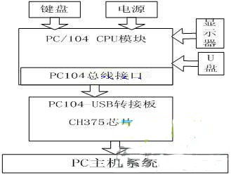 基于CH375芯片的系統(tǒng)還設(shè)計(jì)了PC104-USB轉(zhuǎn)接板,并把其作為PC104主板的擴(kuò)展模塊通過(guò)PC104總線(xiàn)接口與主板相連接。轉(zhuǎn)接板上有兩個(gè)USB接口,任選其中一個(gè)通過(guò) USB轉(zhuǎn)接線(xiàn)與上位機(jī)相連即可。這樣系統(tǒng)的硬件平臺(tái)便建立起來(lái)了,系統(tǒng)硬件連接如圖1所示。下面詳細(xì)介紹系統(tǒng)通訊的軟件實(shí)現(xiàn)。