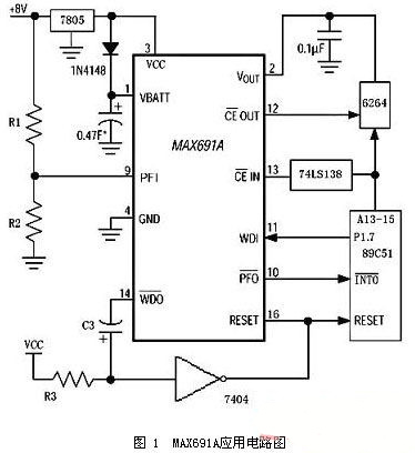 另外,MAX691A還具有振蕩頻率選擇(7、8引腳)等功能,可以調(diào)節(jié)復(fù)位和看門(mén)狗定時(shí)器的時(shí)間。在圖1中,增加了微分電路和反相器,使WDO(——————)直接引發(fā)系統(tǒng)復(fù)位,大大簡(jiǎn)化了軟件的抗干擾設(shè)計(jì)。