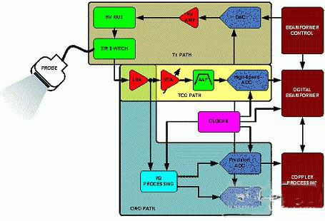 在發(fā)射端(Tx路徑),波束成形器確定了延遲模式和脈沖序列,其是專為所需的焦點(diǎn)而設(shè)定的。然后,驅(qū)動傳感器的高壓發(fā)射放大器將波束成形器的輸出放大。這些放大器可由數(shù)模轉(zhuǎn)換器(DAC)或者高壓FET開關(guān)陣列控制,將發(fā)射脈沖整形,以便較好的將能量傳遞到傳感器單元。而在接收端,發(fā)射/接收(T/R)開關(guān)(通常是二極管電橋)阻擋Tx高壓脈沖。在某些陣列中使用高壓(HV)多路復(fù)用器/多路分離器減少發(fā)射和接收硬件的復(fù)雜度,但是這犧牲了靈活性。