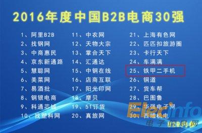 在2016年10月23日,由B2B內(nèi)參舉行的2016中國(guó)B2B峰會(huì)上,鐵甲曾入圍《2016中國(guó)B2B電商百?gòu)?qiáng)榜》,是工程機(jī)械行業(yè)唯一入選企業(yè)。