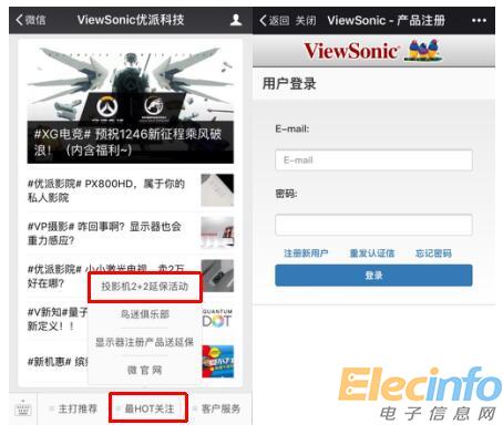 用戶關注“ViewSonic優(yōu)派科技”公眾號(微信號:ViewSonicCN),點擊菜單中的“最HOT關注”,選擇“投影機2+2延?;顒印?。點擊文中閱讀原文,進行產(chǎn)品注冊,即刻暢享優(yōu)派投影機“2+2”延保服務。