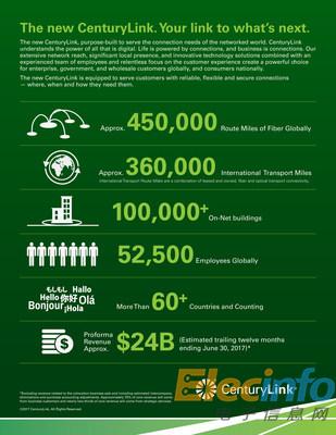 合并后的新公司預(yù)計,約75%的核心收入將來源于企業(yè)客戶,而且近三分之二的核心收入來源于戰(zhàn)略性服務(wù)。預(yù)計合并后的新公司截至2017年6月30日的過去12個月收入達到240億美元(不包括CenturyLink 在2017年5月1日出售數(shù)據(jù)中心業(yè)務(wù)的收入; 但包括預(yù)算合并公司間抵銷帳項及會計調(diào)整)。目前,CenturyLink 的網(wǎng)絡(luò)已覆蓋超過350個城市群,包括十萬多座光纖網(wǎng)內(nèi)建筑,其中位于歐洲、中東、非洲以及拉丁美洲的網(wǎng)內(nèi)建筑達10,000座。