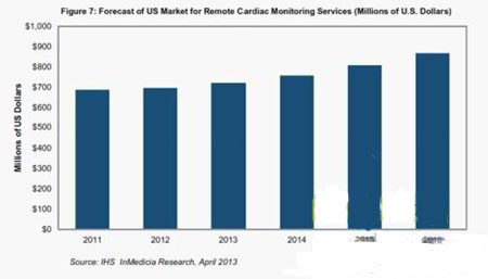 美國是全球最大的遠程心臟監(jiān)控市場,據(jù)IHS InMedica 的報告——“全球診斷用心臟病設備與遠程心臟監(jiān)控服務——2013”,2016年美國市場營業(yè)收入預計將從2011年的6.86億美元增長到8.67億美元,增長率為27%。