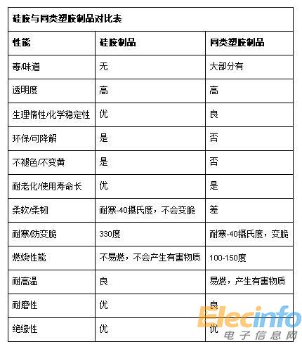 從上面表格中看出,原來(lái)硅膠的性能比其他塑膠產(chǎn)品優(yōu)秀很多。