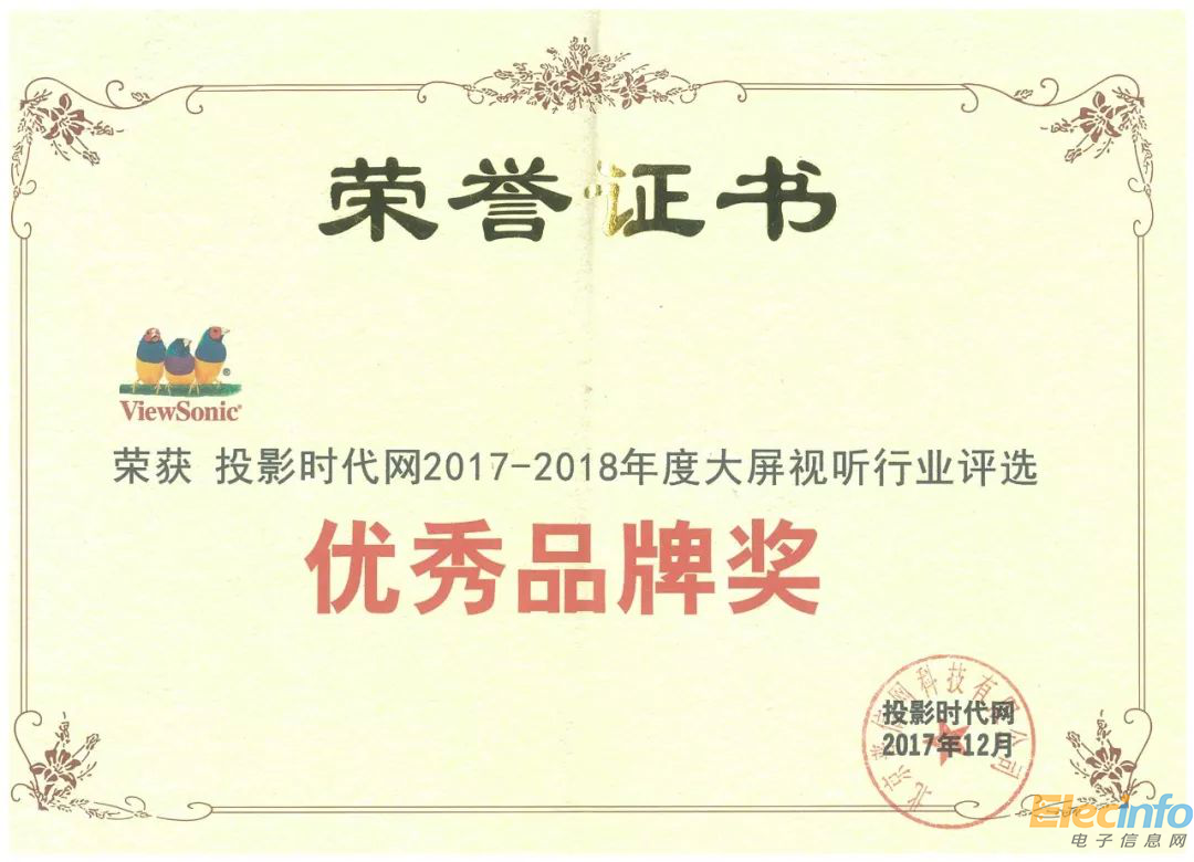 在投影時代網(wǎng)舉辦的2017年度大屏視聽行業(yè)評選中,ViewSonic優(yōu)派獲得年度“優(yōu)秀品牌獎”,在業(yè)內(nèi)樹立了口碑及企業(yè)品牌形象,多年來持續(xù)為科技行業(yè)提供解決方案,讓用戶感受到大屏帶來的便捷及新體驗。