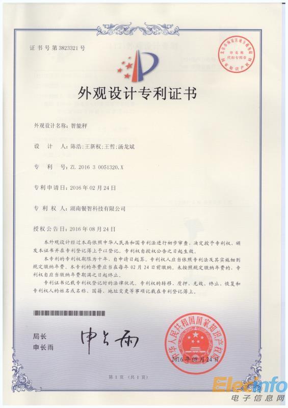 餐鏈智能秤2016年2月申請(qǐng)外觀設(shè)計(jì)專利成功