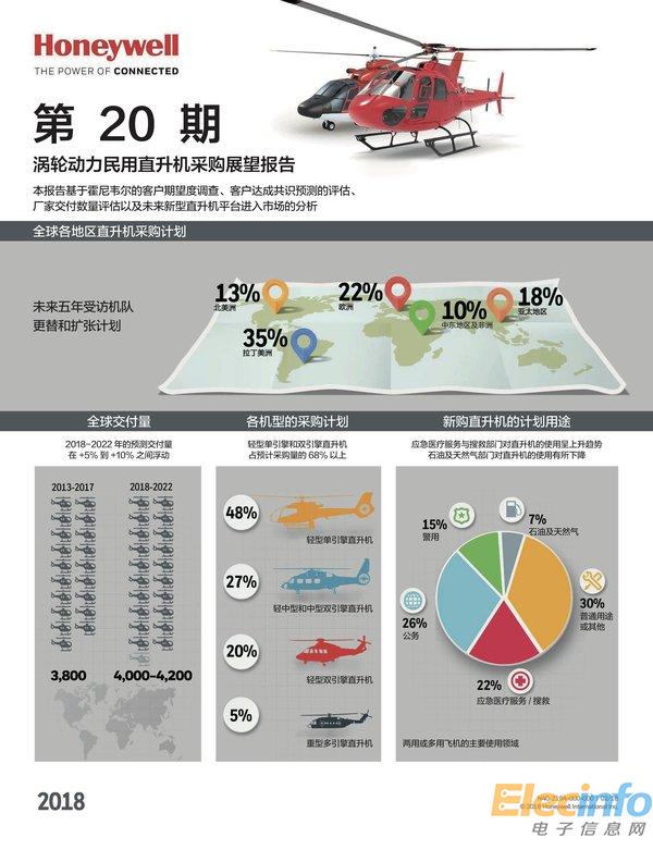 霍尼韋爾航空航天集團(tuán)美洲區(qū)總裁彭睿仕(Ben Driggs)表示:“預(yù)計(jì)未來幾年的全球經(jīng)濟(jì)環(huán)境將有所改善,此外,美國稅務(wù)改革對(duì)直升機(jī)需求具有潛在積極影響,加之石油天然氣市場(chǎng)的波動(dòng)性降低,這些因素都促使機(jī)隊(duì)管理者更加堅(jiān)定其采購直升機(jī)的意向。鑒于未來五年全球直升機(jī)采購計(jì)劃趨于穩(wěn)定,霍尼韋爾將致力于打造互聯(lián)直升機(jī),通過提供發(fā)動(dòng)機(jī)、健康狀態(tài)與使用監(jiān)控系統(tǒng)以及航空電子解決方案,推動(dòng)直升機(jī)的效率和可用性,為運(yùn)營商的現(xiàn)有和未來機(jī)隊(duì)帶來更高增值?!?