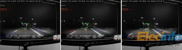 圖像來(lái)源于警方公布的TV監(jiān)視器上的視頻片段。重疊的圖像顯示了Mobileye ADAS系統(tǒng)的響應(yīng)。綠色和白色邊界框是自行車和行人檢測(cè)模塊所輸出的結(jié)果。水平圖顯示了道路和障礙物之間的邊界,我們稱之為“自由空間”。