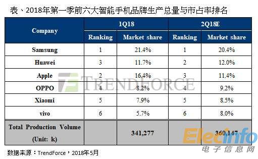 蘋果(Apple)第一季全球市占率排名第二,盡管去年推出的iPhone 8系列及iPhoneX銷售不如預期,但憑借舊機種的降價促銷,支撐第一季生產總量達5,600萬支,相較去年同期成長7.5%;展望第二季,由于處于兩代旗艦機種的過渡期,消費者普遍持觀望態(tài)度,預估第二季的生產總量約4,100萬支,與去年同期持平。