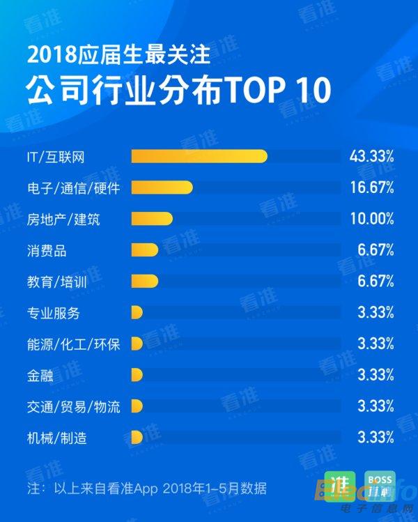 因而,看準媒體部提取了看準網(wǎng)2018年1-5月的數(shù)據(jù),從最受本屆應屆生關注的前30家企業(yè)來看:IT/互聯(lián)網(wǎng)、電子/通信/硬件占有頭兩名。盡管在之前相關報告中顯示,互聯(lián)網(wǎng)行業(yè)今年的求職熱度微降,但是互聯(lián)網(wǎng)確實吸引著大量的優(yōu)秀人才加入。