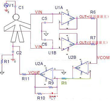 U2A和R9,R10,R11,C7共同組成了右腿驅(qū)動電路,其原理是通過R6,R7從人體取出共模電壓反向加到人體。下面我們通過公式來說明對消驅(qū)動的作用,計算中忽略C5,C6,1A,U1B 的誤差對共模抑制比的影響,同時R10和C7是為了系統(tǒng)穩(wěn)定而設(shè)計的,不影響低頻時共模抑制比的計算,計算時忽略,公式推導(dǎo)如下: