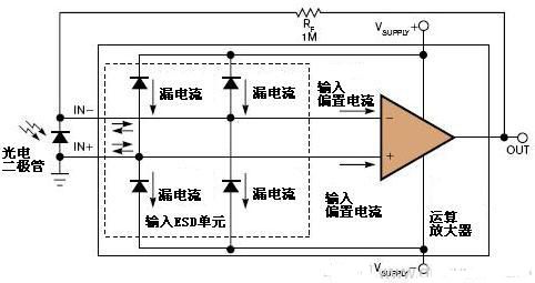 當(dāng)您研究 JFET 或者 CMOS 輸入放大器時(shí),術(shù)語“輸入偏置電流”便失去了它的意義。使用這類放大器,從放大器輸入引腳下拉或者吸取的電流實(shí)際上為輸入 ESD(靜電放電)單元(請參見圖 1)的漏電流。