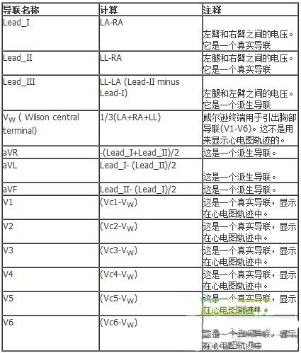 文中這個關(guān)于心電圖的術(shù)語“導(dǎo)聯(lián)(lead)”,指的是兩個電極間的電壓差,這就是設(shè)備記錄下來的差異。例如,“Lead_I”是左臂和右臂電極之間的電壓。Lead_I和Lead_II都指的是肢體導(dǎo)聯(lián)。V1-V6指的是胸部導(dǎo)聯(lián)。心電圖追蹤V1就是Vc1電壓(胸部電極的電壓),和Lead_I,Lead_II ,Lead_ III的平均電壓之間的差別。一個標準的十二導(dǎo)聯(lián)心電圖系統(tǒng)包括八個真實數(shù)值和四個派生值。表1給出了各種導(dǎo)聯(lián)電壓(真實的和派生的)的簡介。
