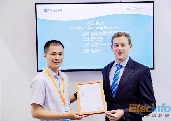 TUV萊茵為浙江萬馬特纜頒發(fā)機器人線纜TUV Bauart Mark認證證書